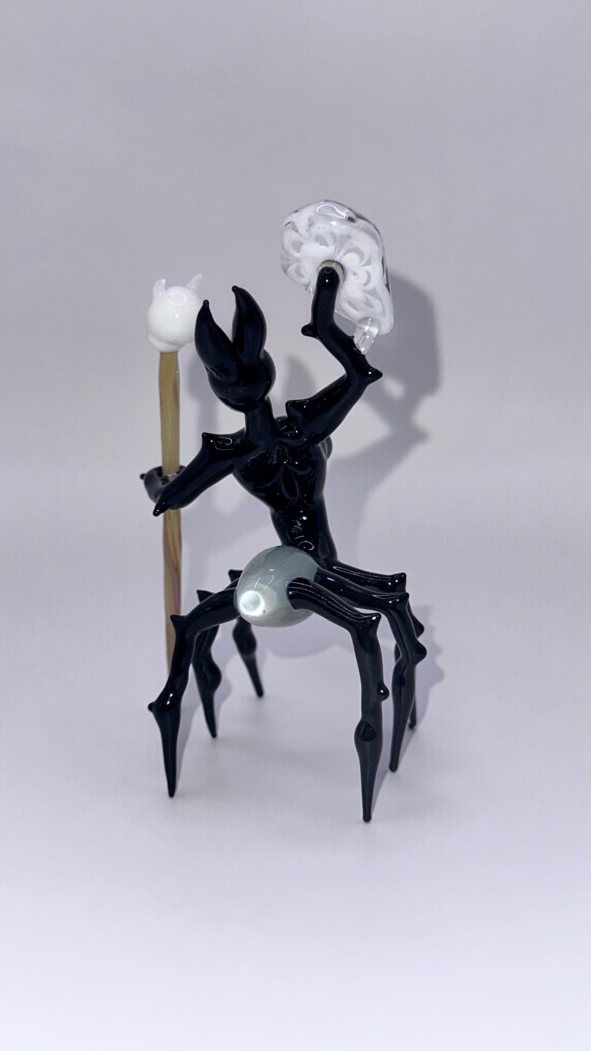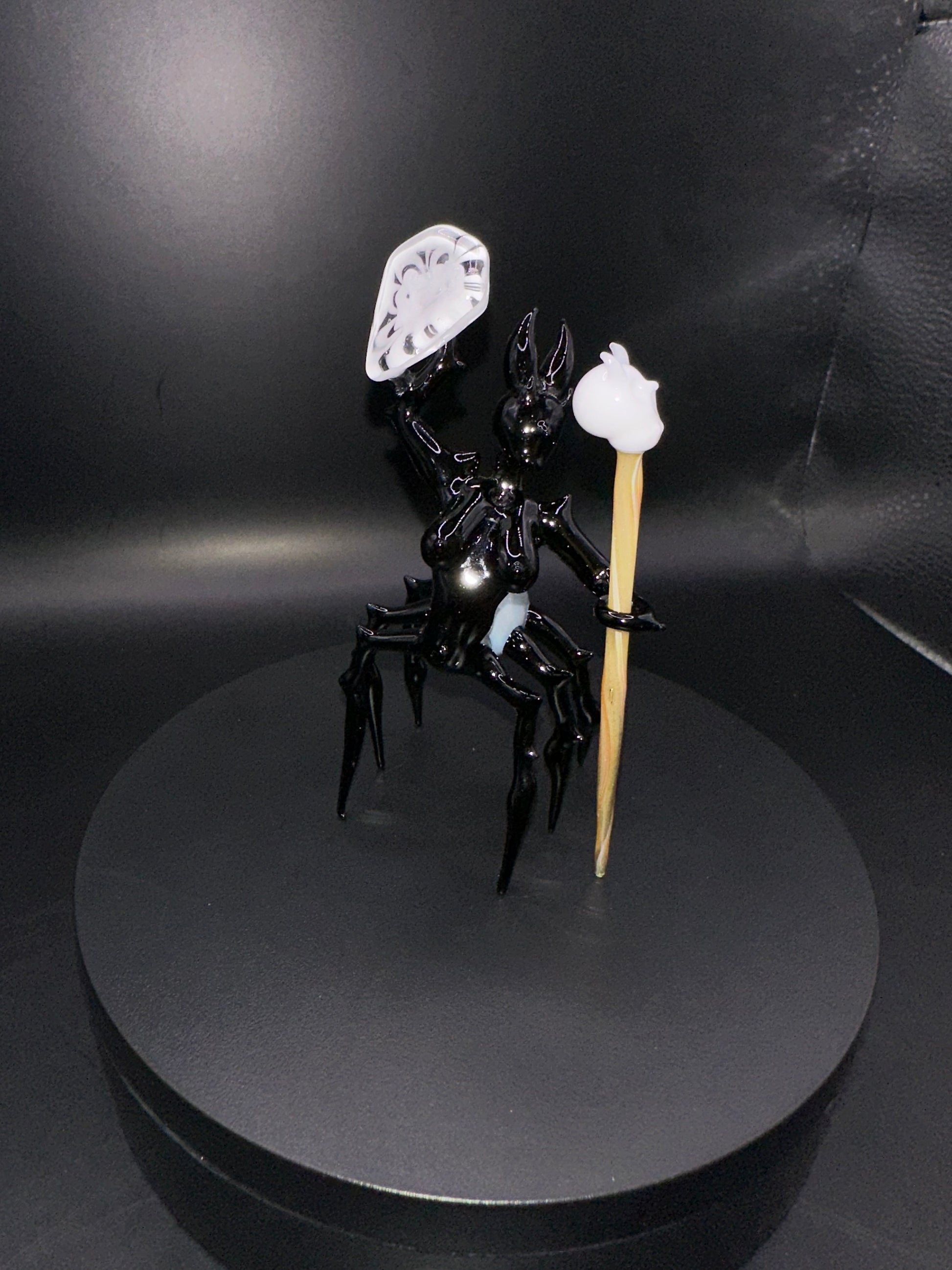From the depths of imagination, the Spider Warrior emerges — part creature, part myth. Dom Greco created this with Galaxy Black borosilicate glass, with a CFL Mirage thorax that shifts color under changing light. Her removable glass staff completes a stance that feels both protective and fierce.